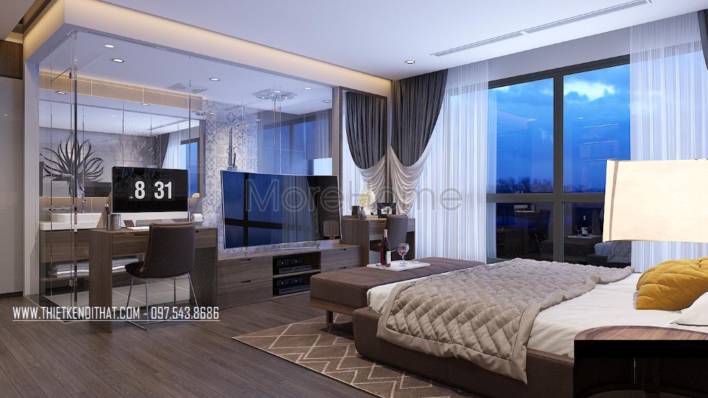 Một điểm đặc biệt của thiết kế này là việc sử dụng kính cường lực để phân chia không gian. Nhờ vào thiết kế này mà không gian phòng tắm và phòng ngủ trở nên thông suốt, khéo léo tạo cảm giác cơi nới cho không gian hẹp mà vẫn đảm bảo sự riêng tư cho khách hàng.