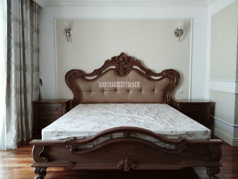 Giường ngủ gỗ óc chó được thiết kế theo phong cách tân cổ điển gợi lên sự tinh tế và gây được thiện cảm với mọi người nhìn.