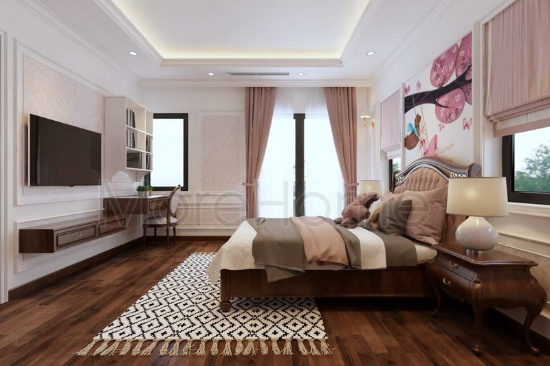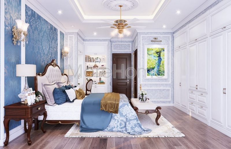 Thiết kế nội thất phòng ngủ biệt thự tân cổ điển sang trọng với sản phẩm giường ngủ gỗ óc chó, đầu giường bọc da cao cấp