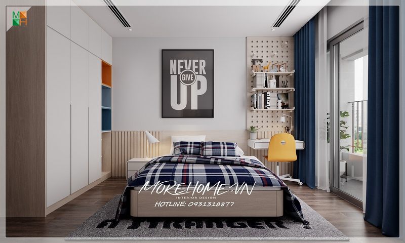 Bàn học có kiểu dáng treo tường hiện đại, được trang trí độc đáo và kết hợp với kệ sách.